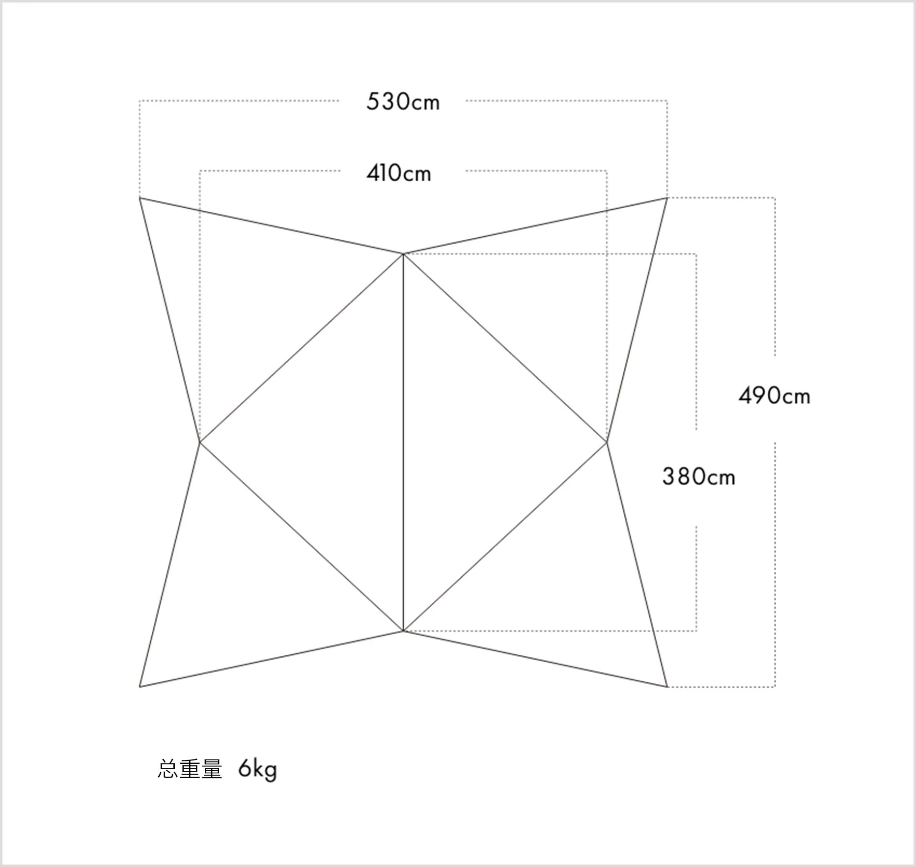 以双侧主杆间的距离来算,相当于中等型号六角天幕的大小,但是有效使用面积却堪比大型号天幕。可根据不同风格随意变换造型。