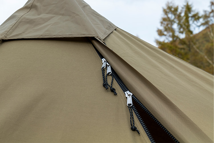 主出入口处的拉链上配有三颗拉链头。通过拉链头可以随意调整开口位置,方便帐内物品摆放设计。