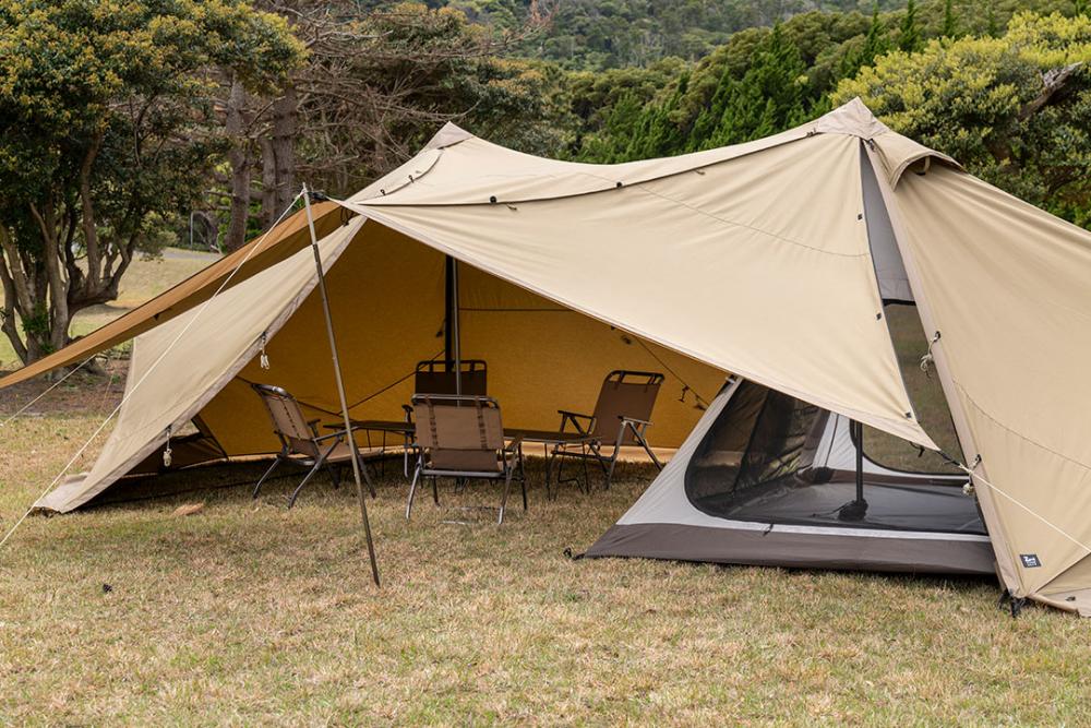 前后门厅帘均可用支撑杆(另售)撑起,扩展空间的同时带来天幕般的开放感,物理性解决了金字塔帐夏季闷热的缺点。