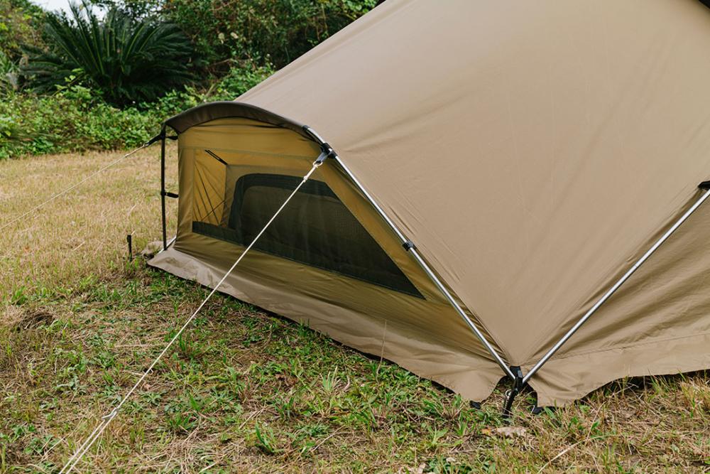 后室部分为向后突出的屋檐式设计,雨水不易淋入,并且附有网纱。本体与内帐的网纱位置为对应设计,可轻松调整帐内通风程度。