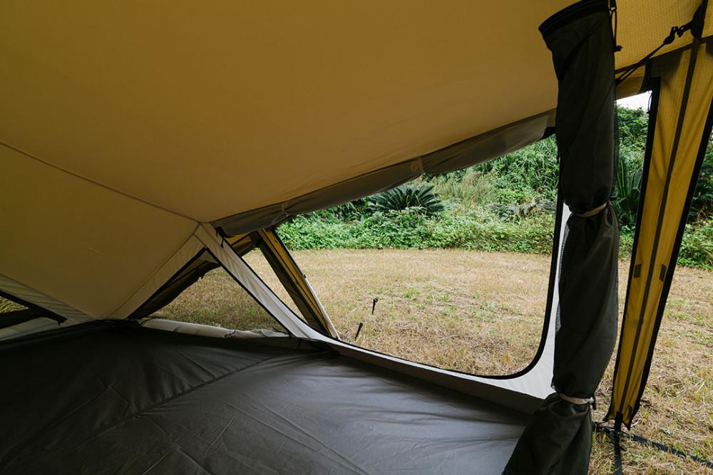 前厅门帘的部分为可变式造型。可根据营地环境,拉起两侧保持隐秘空间的同时,单独撑起上方部分用来遮阳;相反也可以关闭上方部分将两侧卷收起来以保持通风。