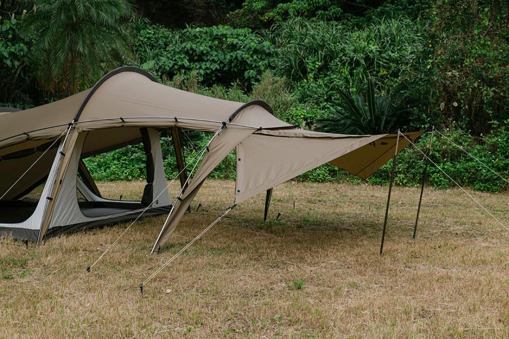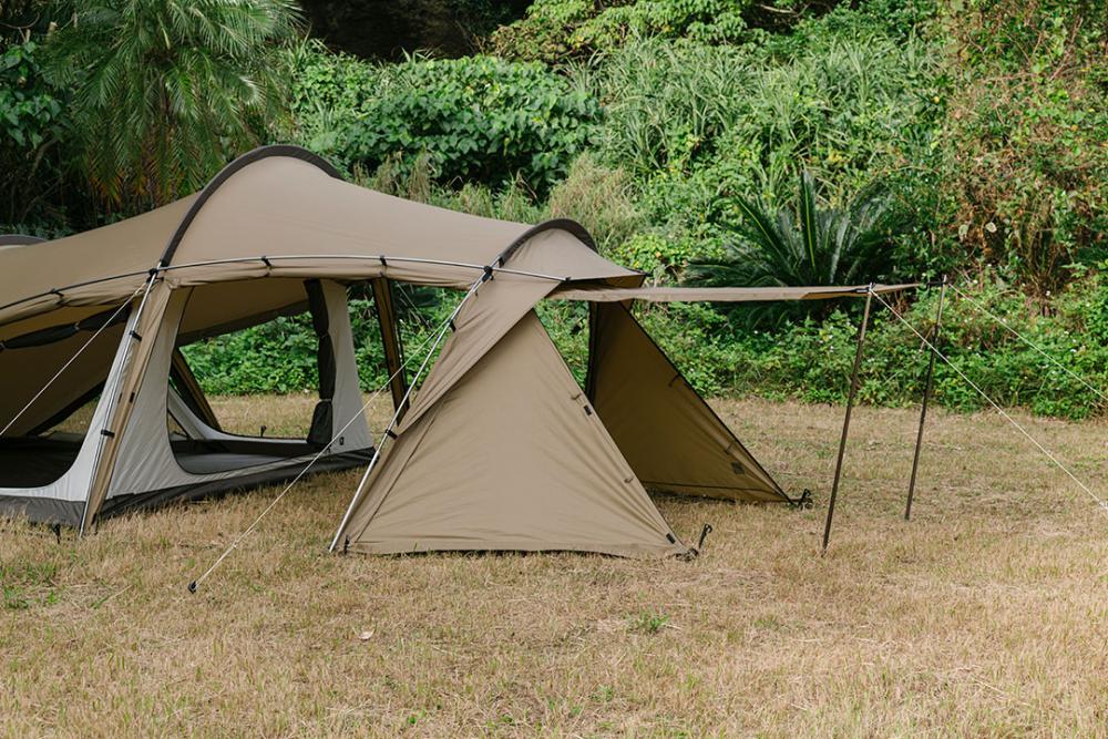 前方的出入口可进行拓展延伸搭建(需另配支撑杆及风绳)。前厅撑起后,可额外获得较宽敞的空间,足可供4人起居使用。