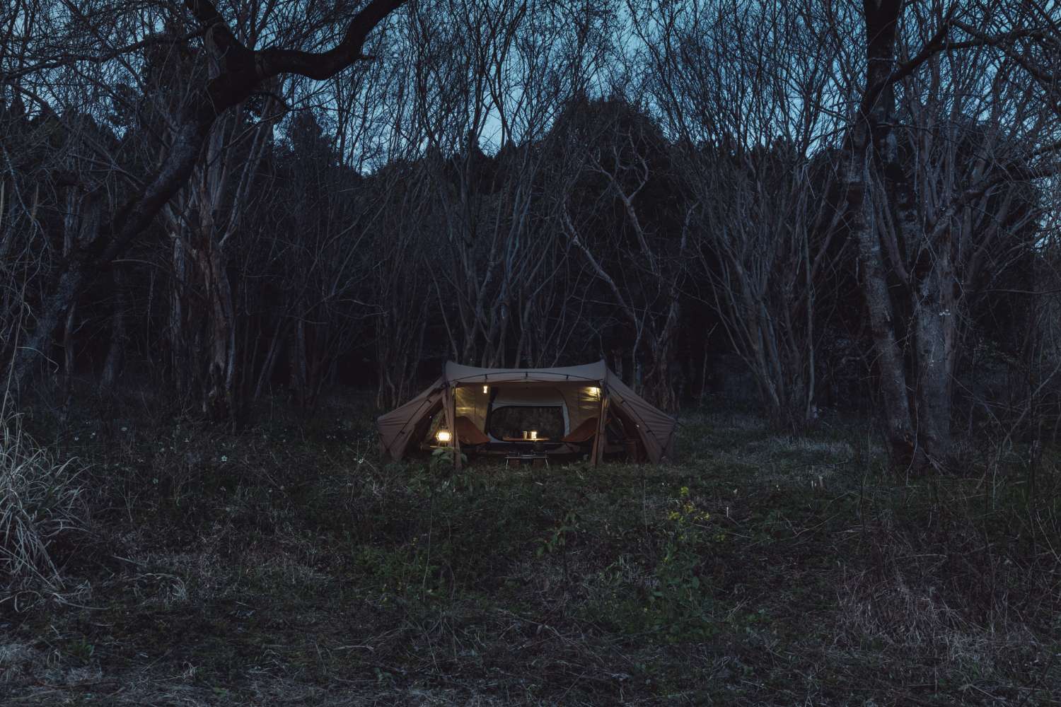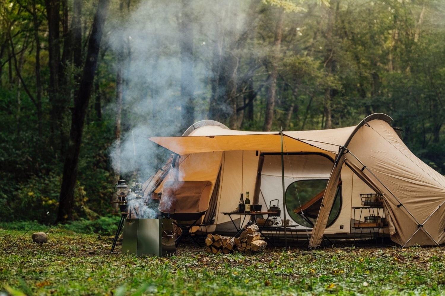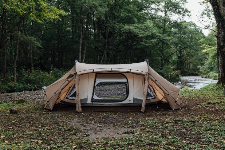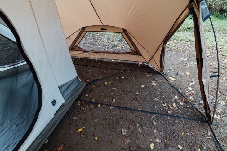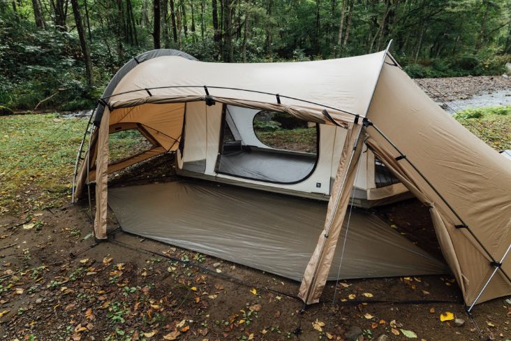 倘若不挂内帐,便可以单纯作为客厅帐来使用。即使在客厅帐全部封闭的情况下,其空间内仍可放置供双人使用的桌椅、厨具、行军床等物品。