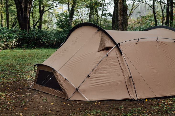将帐杆组装搭建好之后,无需地钉即可自立。即使在有碎石等不便使用地钉的地面也可以轻松设营。(但请注意避免帐篷被强风吹走)
