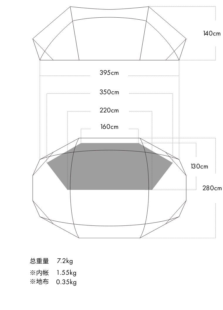 采用聚酯纤维抗撕裂SIL/PU涂层面料,外侧为硅涂层,内侧为PU涂层,实现了高强度的抗撕裂性及防水性能。与市面上广泛使用的特氟龙涂层处理不同,硅涂层处理的方式可以有效的渗透至面料当中,提高面料抗撕裂的强度。与普通帐篷面料相比,具有轻薄且强度高等特点。