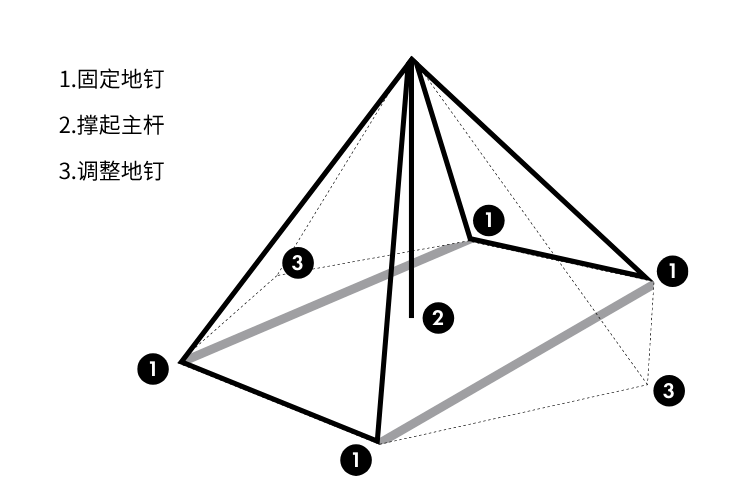 只需利用定位带先将帐底四个角固定成长方形,然后使用主杆撑起帐顶,便能够轻松的搭建起来。帐底为易分辨的对称多边形,设营简单易上手。